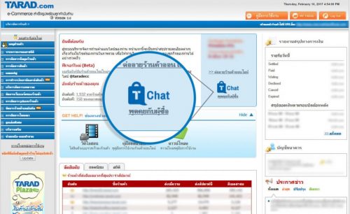 - กรณี เข้าผ่านระบบหลังร้าน Backoffice.tarad.com เข้าสู่ระบบ และสังเกตส่วนกลางของหน้าระบบหลัก จะเห็นสัญลักษณ์ T-Chat คลิก เพื่อเข้าสู่ระบบได้ทันที